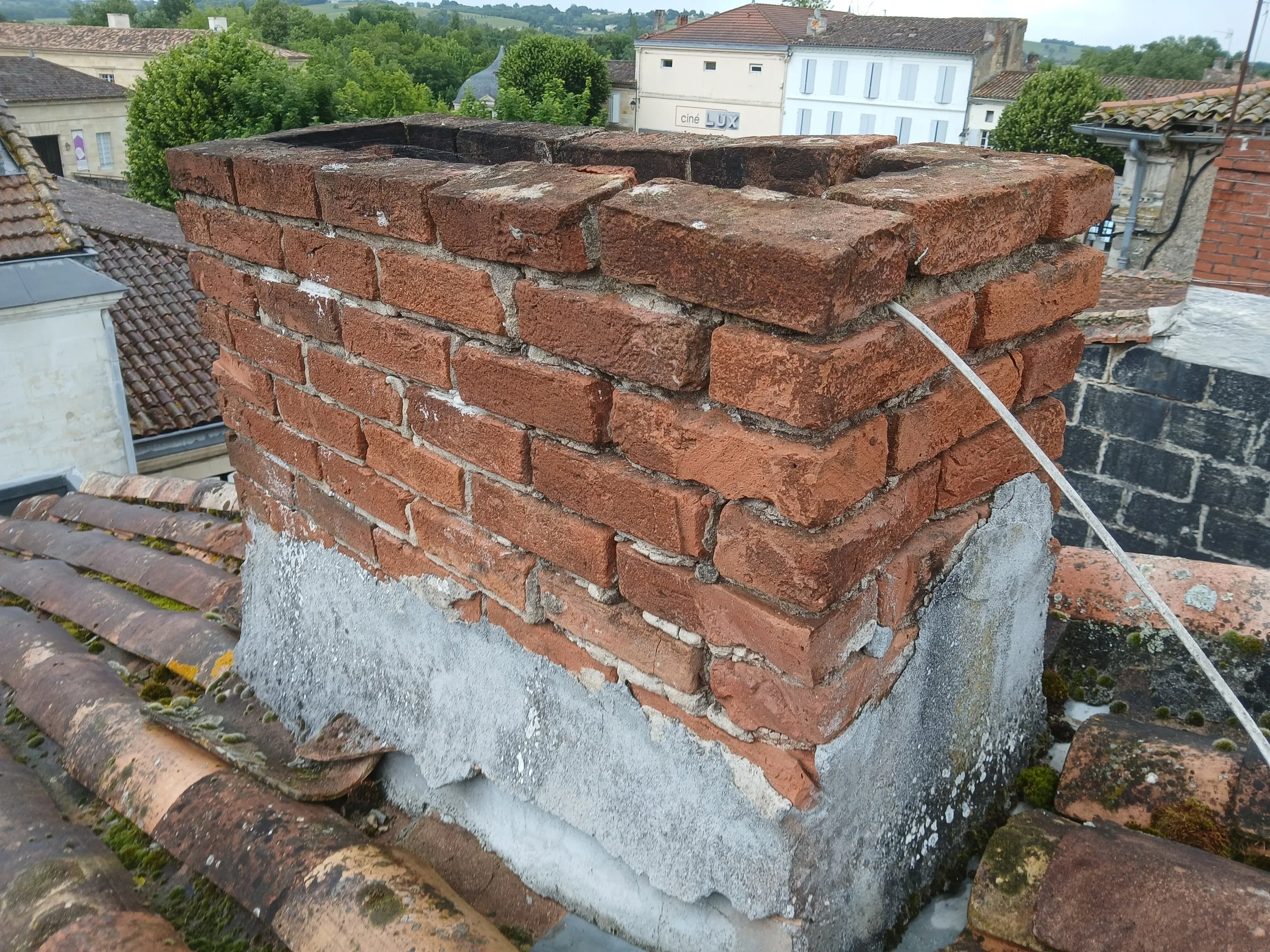 Travaux de réparation sur une cheminée en brique sur un toit. Un artisan porte un gant bleu et manipule une pièce en métal.