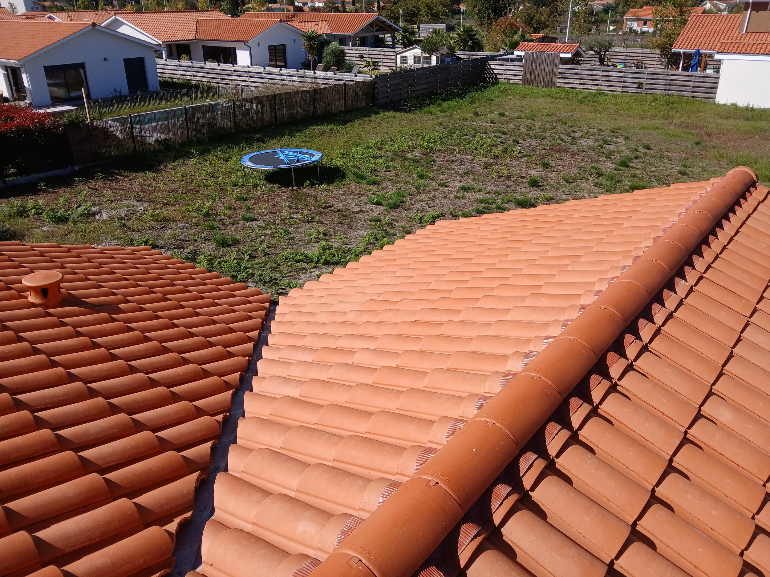 Vue aérienne de toits de tuiles en terre cuite rouge, avec un jardin vide et une piscine gonflable en face, entourée de barrières en bois, dans un quartier résidentiel avec d'autres maisons similaires en arrière-plan.